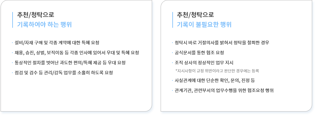 - - 청탁인지 정상적인 업무인지 애매한 경우에는 청탁여부를 판단하지 말고 모든 내용을 시스템에 100% 등록하는 것을 원칙으로 함