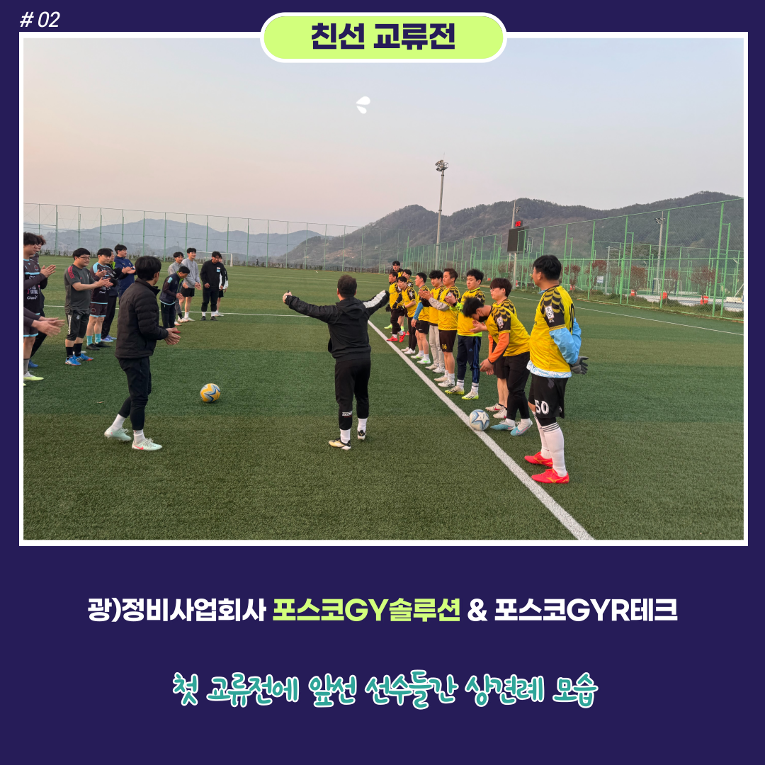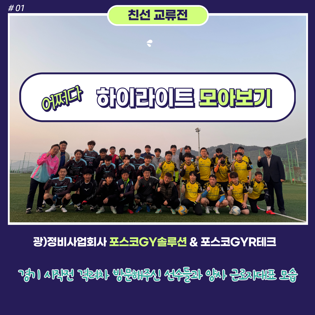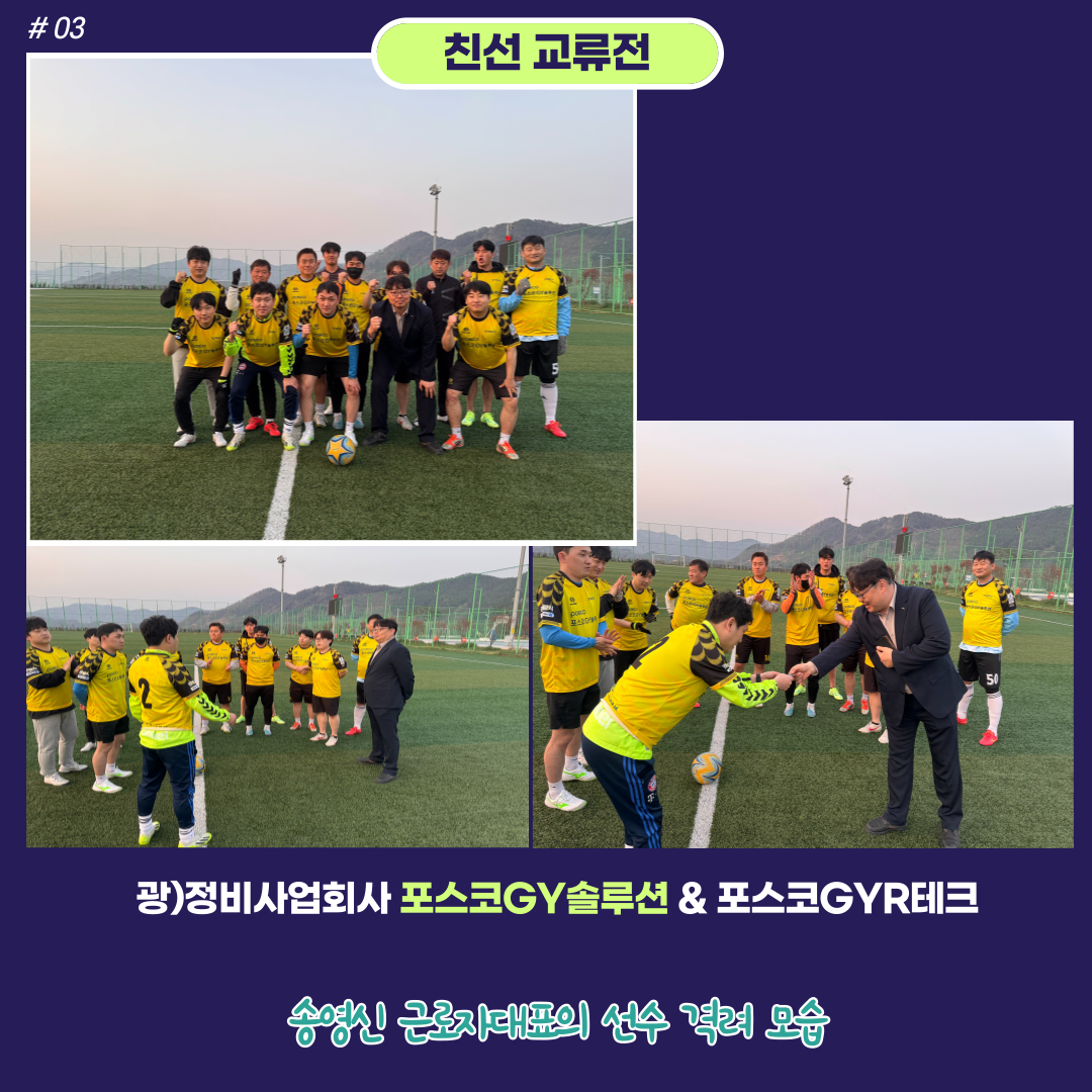 지난 10일 우리 회사 축구동호회와 작년에 발족한 우리 이웃회사인 포스코GYR테크 축구동호회간 친선 교류전을 진행하였습니다.